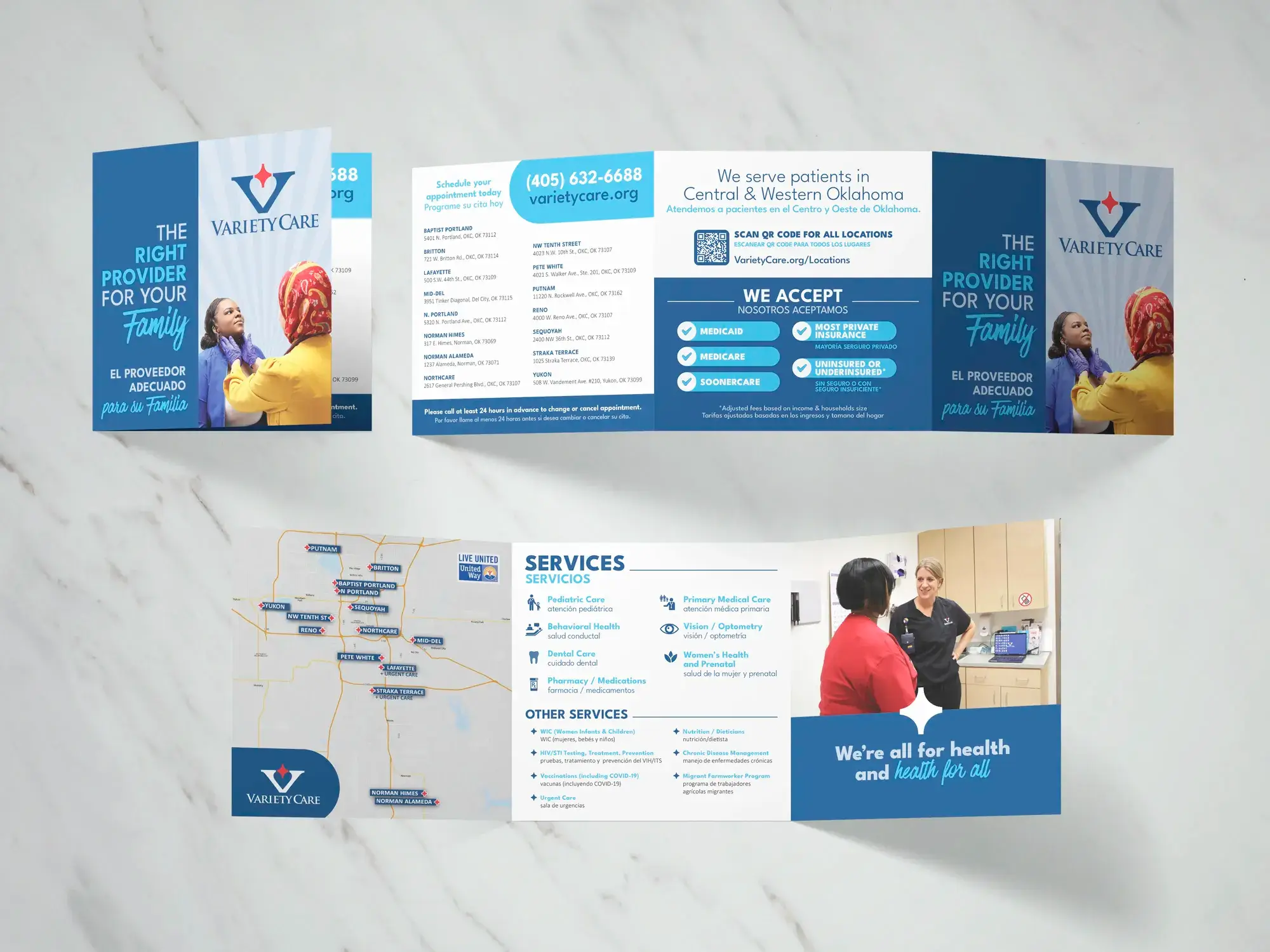 I designed this brochure to make it easier for people to find and book appointments. It was important to include service and insurance information because so many Oklahoman's are either underinsured or uninsured. I also included a Spanish translation for all elements to ensure it would reach hispanic communities, which is about 12% of Oklahomans.